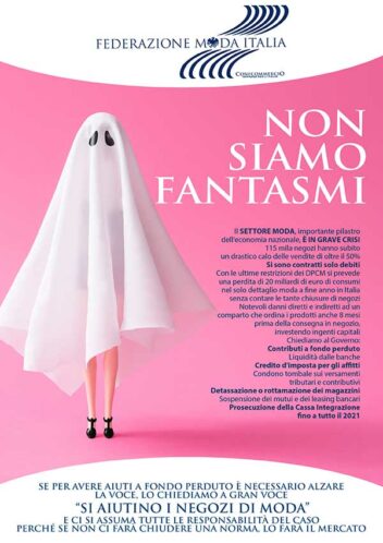 Pescara – Grido d’allarme del settore abbigliamento. La Federmoda/Confcommercio con lo slogan “Non siamo fantasmi” ha lanciato la campagna di sensibilizzazione del settore rivolta alle istituzioni e al Governo in primis. L’associazione di categoria, alla quale aderiscono le imprese del commercio al dettaglio e all’ingrosso di abbigliamento, calzature e pelletterie, reclama visibilità e tutela per la categoria, in considerazione della grave crisi che la pandemia ha causato anche nel settore.
