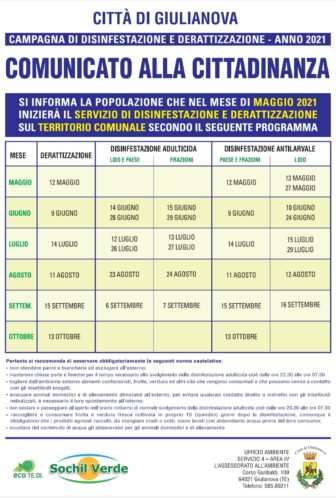 Giulianova – Al via il nuovo intervento di disinfestazione adulticida notturna contro le zanzare, nel territorio di Giulianova. Le operazioni, effettuate dagli operatori e dai mezzi della ditta specializzata, avverranno nella notte compresa tra lunedì 28 e martedì 29 giugno, a partire dalle ore 23.00 circa, nelle zone del Lido e del Paese. Le frazioni, invece, verranno interessate dagli interventi di disinfestazione nella notte successiva, ovvero quella tra martedì 29 e mercoledì 30 giugno, sempre dalle ore 23.00.
