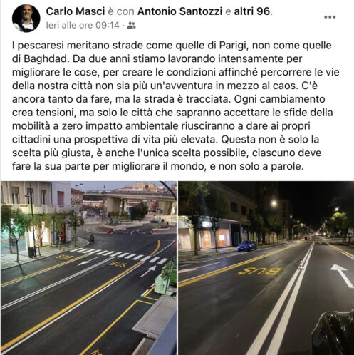 “Una seduta –spiegano i consiglieri di opposizione– nella quale in ben due occasioni si è palesata la ormai violenta crisi della maggioranza, con il presidente del Consiglio Comunale sceso ad annunciare una ulteriore modifica del progetto poche ore dopo che il sindaco aveva paragonato la nuova viale Marconi ad una strada di Parigi e dopo aver completato la segnaletica orizzontale, e con il capogruppo di Fratelli d’Italia che ha chiesto le dimissioni del suo assessore Alfredo Cremonese in uno scontro pubblico e molto duro con l’altra consigliera del suo partito. Tutto ciò – spiegano i consiglieri di centrosinistra – davanti ad un attonito comitato dei commercianti invitato a partecipare alla commissione, e che poco prima aveva riferito punto per punto dei tagli ai marciapiedi effettuati nottetempo, degli incidenti aumentati, della percezione di assistere alla trasformazione di viale Marconi in una tangenziale. È del tutto evidente che il centrodestra, che tutto insieme aveva celebrato il nuovo progetto di viale Marconi, ora non sa come uscirne e sta trasformando anche questo cantiere nel campo di battaglia fra correnti diverse della maggioranza. È il momento di dire la verità ai cittadini”.