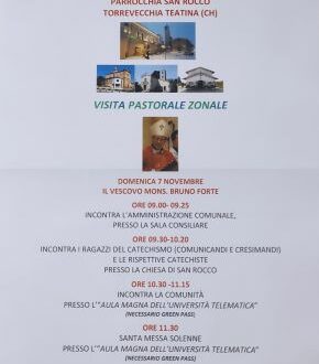 Torrevecchia Teatina. Grandi preparativi a Torrevecchia Teatina da parte della cittadinanza e dell’amministrazione comunale guidata dal sindaco Francesco Seccia dove la prossima domenica 7 novembre, alla Parrocchia San Rocco, ci sarà la visita pastorale zonale del vescovo dell’Arcidiocesi di Chieti-Vasto, Monsignor Bruno Forte.