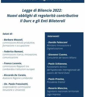 Milano. Il prossimo giovedì 24 febbraio, nella Sala Pirelli della Regione Lombardia a Milano, si terrà il convegno dal titolo “Legge di Bilancio 2022: Nuovi obblighi di regolarità contributiva. Il Durc e gli Enti Bilaterali” al quale parteciperà anche Enbital.
