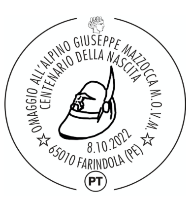 Completano l’annullo le scritte «Omaggio all’alpino Giuseppe Mazzocca M.O.V.M.», «Centenario della nascita» e «8.10.2022 – 65010 Farindola (PE)».