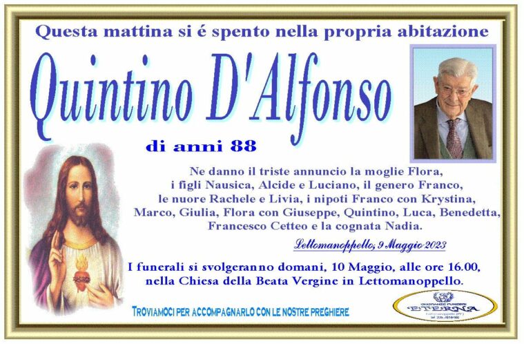 La scomparsa di un genitore rappresenta un momento difficile nella vita di ciascuno. A nome personale e dell’intera giunta regionale porgo le condoglianze all’onorevole Luciano D’Alfonso per la perdita del padre Quintino” ha commentato esprimendo vicinanza il Presidente della Regione Abruzzo, Marco Marsilio.