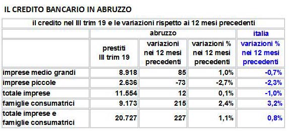In valore percentuale, le differenze si notano in maniera ancora più netta, se possibile. Così, se il credito al mondo delle micro imprese in Abruzzo è diminuito del 2,7%, contro il 2,3% nazionale, quello erogato alle imprese medio-grandi risulta addirittura di segno opposto: l’aumento registrato in Abruzzo (un punto percentuale in più) risulta infatti in netta controtendenza rispetto alla media nazionale (-0,7%). Complessivamente, dunque, a fine settembre del 2019 il barometro del credito ha segnato in Abruzzo una consistenza (ovvero il valore complessivo del totale degli impieghi effettuati dal sistema bancario a favore di imprese e famiglie, ndr) di 20 miliardi e 727 milioni di euro, registrando, sui 12 mesi precedenti, al netto delle cessioni delle sofferenze, un incremento di 227 milioni. Quanto ai depositi e al risparmio postale, infine, lo stesso periodo registra, rispetto al 2018, un aumento di 394 milioni di euro: 27 miliardi e 121 milioni, contro 26 miliardi e 727 milioni.