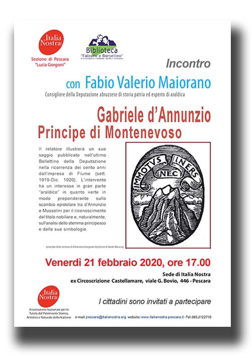 Pescara – L’associazione Italia Nostra di Pescara promuove un ncontro con Fabio Valerio Maiorano, Consigliere della Deputazione abruzzese di storia patria ed esperto di araldica, che illustrerà un suo saggio su “Gabriele d’Annunzio Principe di Montenevoso” pubblicato nell’ultimo Bollettino della Deputazione nella ricorrenza dei cento anni dall’impresa di Fiume (sett. 1919-Dic. 1920). L’intervento spiegano i rappresentanti dell’associazione, ha un interesse in gran parte “araldico” in quanto verte in modo preponderante sullo scambio epistolare tra d’Annunzio e Mussolini per il riconoscimento del titolo nobiliare e, naturalmente, sull’analisi dello stemma principesco e delle sue simbologie.
