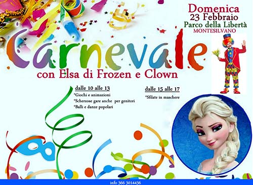 Domenica, al Parco della Libertà di Montesilvano, anche quest’anno il Carnevale si festeggia in mezzo alla natura, con Clown e l’incantevole Elsa di Frozen, notissimo personaggio della Disney, che non solo sarà a disposizione per foto ricordo, ma farà scoprire anche le bellezze, nascoste, del più grande e attrezzato parco non solo di Montesilvano, mediante un percorso animato .