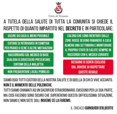 Teramo – Sebbene il Comune di Teramo non rientri nelle zone rosse decretate dal Governo, la straordinarietà dell’emergenza sanitaria che il Paese sta vivendo riguarda anche il nostro territorio e rende necessario rafforzare e coordinare i presidi istituzionali. Domani, con Ordinanza del Sindaco, sarà attivato il COC che in questa fase di pre-allerta avra le seguenti finalità: