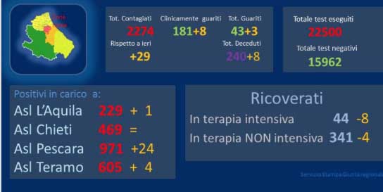 Nel numero dei casi positivi sono compresi anche 240 pazienti deceduti (+8 rispetto a ieri): i nuovi decessi (alcuni dei quali avvenuti nei giorni scorsi, ma la cui positività al virus è arrivata oggi) riguardano un 76enne e un 61enne di Montesilvano, una 85enne di Spoltore, una 94enne e un 86enne di Pescara, un 71enne di Giulianova, un 64enne di Atri e un 91enne di Atessa (spetterà in ogni caso all’Istituto Superiore di sanità attribuire le morti al Coronavirus, in quanto si tratta di persone che potrebbero già essere state affette da patologie pregresse); 224 guariti (+11 rispetto a ieri, di cui 181 che da sintomatici con manifestazioni cliniche associate al Covid 19, sono diventati asintomatici e 43 che hanno cioè risolto i sintomi dell’infezione e sono risultati negativi in due test consecutivi).
