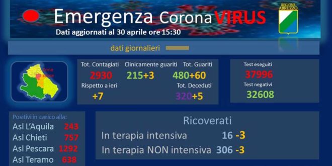 Pescara – In Abruzzo, dall’inizio dell’emergenza, sono stati registrati 2930 casi positivi al Covid 19, diagnosticati dai test eseguiti nel laboratorio di riferimento regionale di Pescara, dall’Istituto Zooprofilattico di Teramo e dall’Università di Chieti. Rispetto a ieri si registra un aumento di 7 casi su un totale di 1035 tamponi analizzati (0.67 per cento di positivi sul totale). Nella giornata di ieri (29 aprile) i positivi erano stati 24 su un totale di 1187 tamponi analizzati (2 per cento).