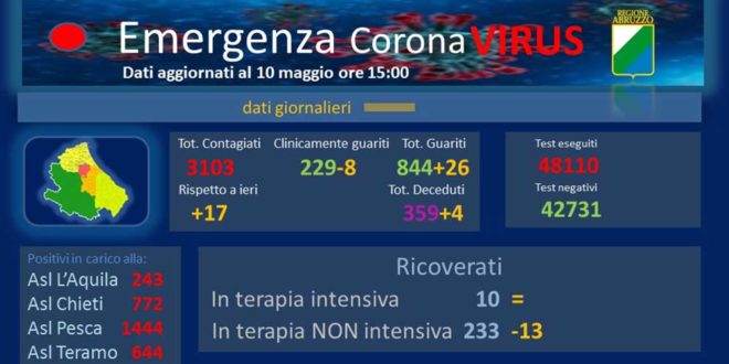Coronavirus: in Abruzzo si registrano 17 nuovi casi e 4 decessi – dati aggiornati al 10 maggio