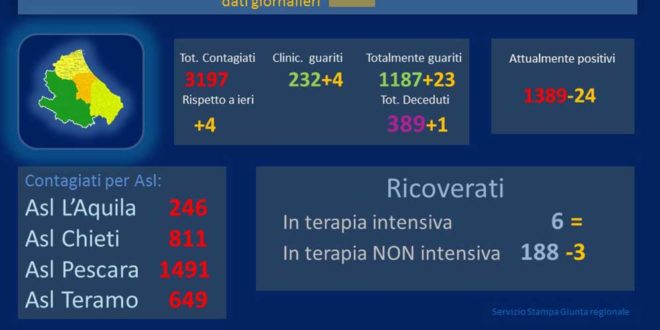 Gli attualmente positivi in Abruzzo (calcolati sottraendo al totale dei positivi, il numero dei dimessi/guariti e dei deceduti) sono 1389, con una diminuzione di 24 unità rispetto a ieri.