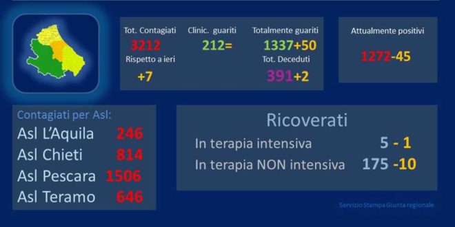 Gli attualmente positivi in Abruzzo (calcolati sottraendo al totale dei positivi, il numero dei dimessi/guariti e dei deceduti) sono 1272, con una diminuzione di 45 unità rispetto a ieri.
