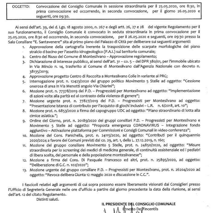 Montesilvano – Torna d essere convocato domani dopo un lungo periodo di inattività dovuto all’emergenza coronavirus il Consiglio comunale, i lavori dell’assise, ora in seconda convocazione avranno inizio alle 9,30.
