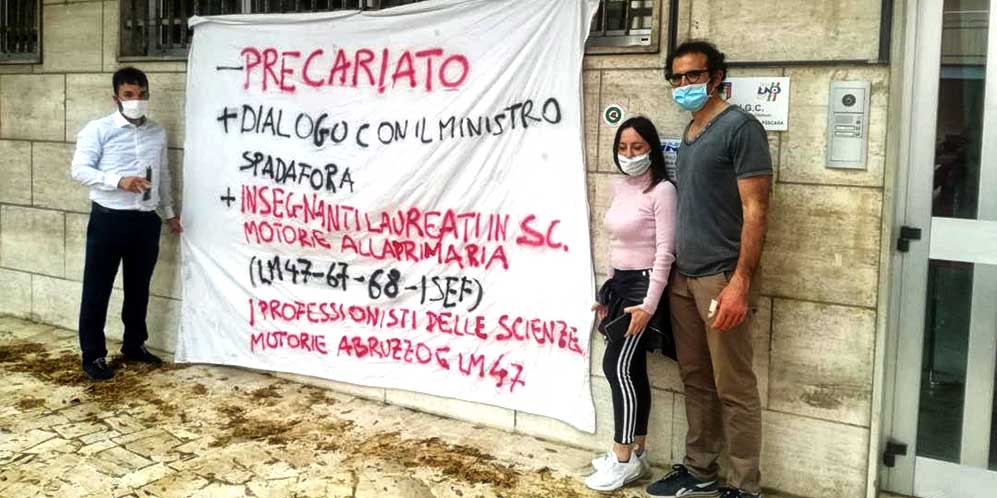 I professionisti delle Scienze Motorie, tutor nelle scuole primarie in Abruzzo sono 300 laureati nelle classi magistrali di Scienze motorie e diplomati Isef coinvolti nei due progetti “Sport di classe” promosso dal Miur e da Sport e salute S.p.a. (Coni) e “Sport in Movimento” promosso da Regione Abruzzo e Coni. A margine del presidio hanno spiegato come i progetti da loro seguiti, “Sport di classe” e “Sport in movimento”, abbiano permesso ai bambini di quarta e quinta, prima e seconda elementare di svolgere meno di 1 ora a settimana di educazione motoria a scuola. L’insegnamento di “Educazione fisica” come materia curriculare infatti è prevista solo nelle scuole secondarie (medie e superiori).