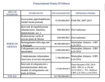 1) Al netto degli auspici e delle considerazioni di maniera, oltre che della rilevanza resa palese anche dalla partecipazione straordinaria del Presidente Marsilio in carne e ossa, il fatto principale acclarato tanto trionfalmente è che si realizzeranno i lavori per l’ampliamento e lo sviluppo del porto di Ortona, lavori resi possibile esclusivamente grazie ai 51 milioni di euro destinati a questo fine dal Masterplan concepito, elaborato e finanziato dalla Giunta Regionale che ho presieduto sino a due anni fa. Quei fondi restano gli unici che saranno utilizzati per realizzare le opere che ieri Febbo e Marsilio hanno illustrato.