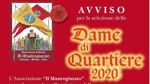 Ciò detto, l’Associazione Il Mastrogiurato invita tutte le amiche, signore, donne e fanciulle a partecipare alla Selezione 2020 per le Dame di Quartiere. Basta essere maggiorenni e rispondere ai requisiti richiesti per provare ad essere per un giorno la protagonista della Rievocazione Storica più antica d’Abruzzo! Per partecipare basta comunicare la propria adesione inviando una e-mail al seguente indirizzo “ilmastrogiurato@gmail.com” indicando il proprio nome, cognome, indirizzo, recapito telefonico ed allegando da 2 a 4 foto (recenti) di cui almeno una in primo piano ed una a figura intera. Le candidate saranno contattate successivamente. Le iscrizioni si chiuderanno il 18 luglio 2020. Rullo di tamburi e squillo di chiarine