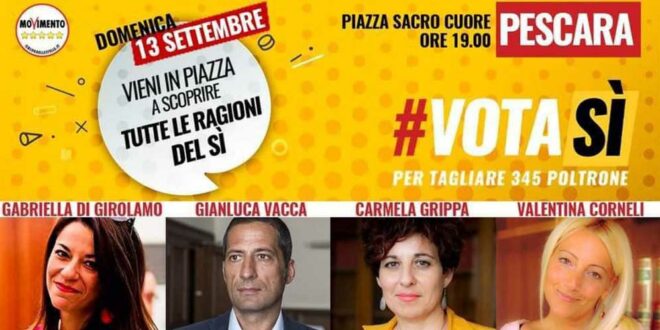 PESCARA, 11 settembre 2020 – Prosegue l’azione informativa del Movimento 5 Stelle di Pescara che, anche in questo weekend, sarà in piazza per sensibilizzare i cittadini sulle ragioni del Sì al referendum confermativo sul taglio dei parlamentari. L’iniziativa avrà luogo sabato 12 e domenica 13 Settembre in Piazza Sacro Cuore, con un momento di approfondimento specifico con i parlamentari abruzzesi Gianluca Vacca, Carmela Grippa, Gabriella Di Girolamo e Valentina Corneli.