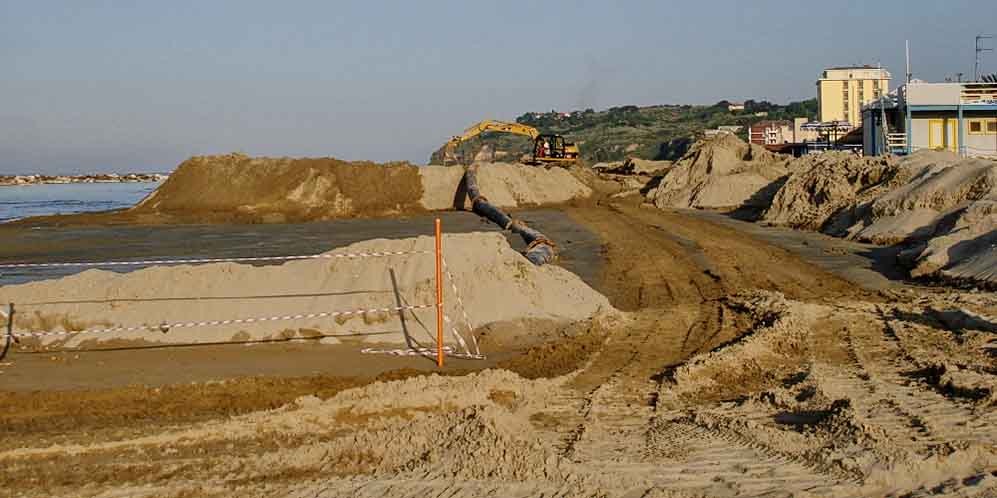 A)nessuna attenzione alle dune presenti alla Stazione di Tollo, e, soprattutto, alle precauzioni da adottare per evitare che siano danneggiate durante lavori che saranno mastodontici (nella foto il ripascimento avvenuto anni fa nell’area di Lido Riccio, già antropizzata, che fa comprendere il possibile impatto su una spiaggia). Non viene allegato al progetto alcun rilievo (planimetrie ecc) di dettaglio della distribuzione della vegetazione dunale né sono citate misure di precauzione (delimitazione area di cantiere ecc);