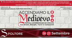 Si avvia a conclusione l’evento “Accendiamo il Medioevo”, iniziato il 7 agosto a Roccacaramanico e che si concluderà nel prossimo fine settimana con manifestazioni a Città S. Angelo ( 25 e 26 settembre) e a Spoltore (26 e 27 settembre). Grande partecipazione di pubblico in tutte le circostanze e valorizzazione del Patrimonio culturale medioevale, sconosciuto e non fruibile. Un evento …