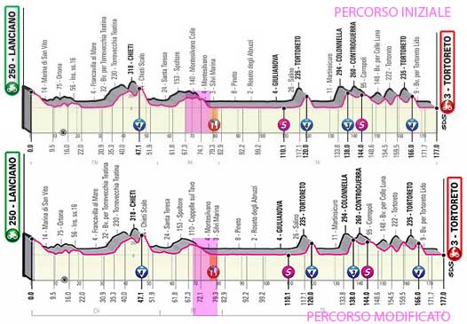 A causa delle strade malmesse e del taglio da parte della giunta regionale di centrodestra dei fondi messi a disposizione per la manutenzione straordinaria delle strade interessate dal passaggio della “carovana rosa”, la provincia di Pescara e l’organizzazione del Giro hanno deciso di escludere dal percorso Montesilvano Colle, “borgo autentico d’Abruzzo”. I corridori da Spoltore sono transitati da Cappelle sul Tavo per poi imboccare Via Vestina e la strada Nazionale Adriatica fino all’arrivo a Tortoreto».
