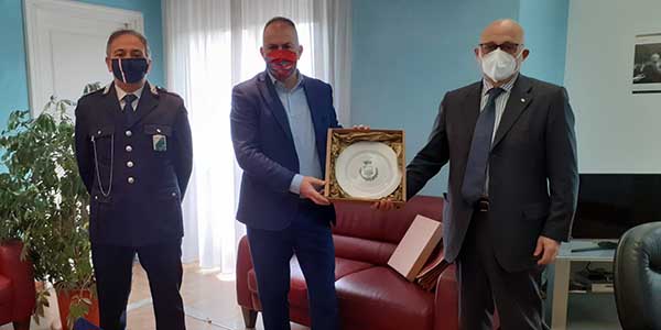 Montesilvano – Questa mattina il sindaco Ottavio De Martinis e il comandate della polizia locale Nicolino Casale hanno effettuato una visita istituzionale al nuovo Questore di Pescara Luigi Liguori, che ha preso servizio il primo dicembre scorso, sostituendo Francesco Misiti. Il primo cittadino ha donato al nuovo questore un piatto di ceramica decorato con lo stemma di Montesilvano dall’artista locale Duccio Gammelli.