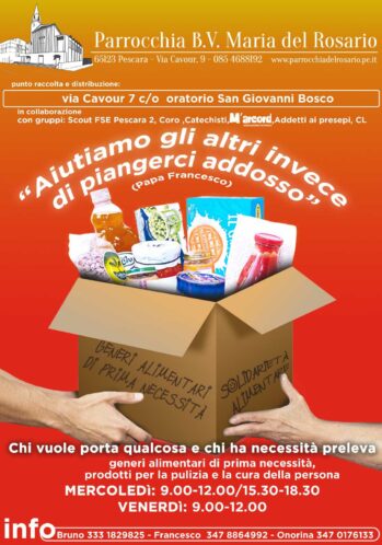 Pescara – Segnaliamo una lodevole iniziativa messa in atto dalla Parrocchia B.V. Maria del Rosario, in collaborazione con gruppi Scout, Catechisti, Coro, Addetti ai presepi, l’associazione M’Arcord e CL, che in questi momenti di difficoltà hanno pensato bene di creare un punto di raccolta dove poter portare beni di prima necessità, alimenti non deperibili, detersivi per la cura della persona e per la pulizia disponibili in un punto di prelievo dove chi ha bisogno in totale anonimato potrà prendere quanto gli è necessario.