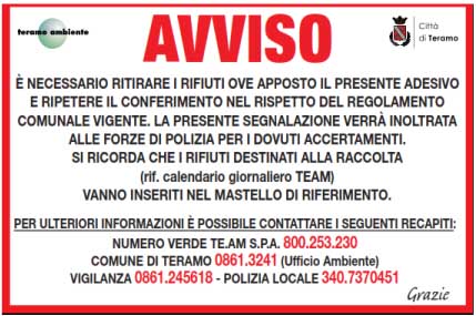 Il Municipio ricorda, infine, che è vietato esporre il rifiuto urbano indifferenziato (RUR) solo con la busta senza inserirlo nell’apposito contenitore di colore grigio, dato all’utenza in comodato d’uso gratuito dalla società che gestisce la raccolta, la Teramo Ambiente spa.