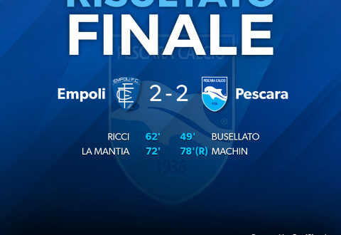 Empoli. Punto d’oro per il Pescara che impatta 2-2 in quel di Empoli ed il tecnico Breda salva, per ora, la panchina. Biancazzurri in vantaggio con Busellato, i toscani ribaltano il risultato con Ricci e La Mantia, rete del definitivo pari siglata da Pepín.