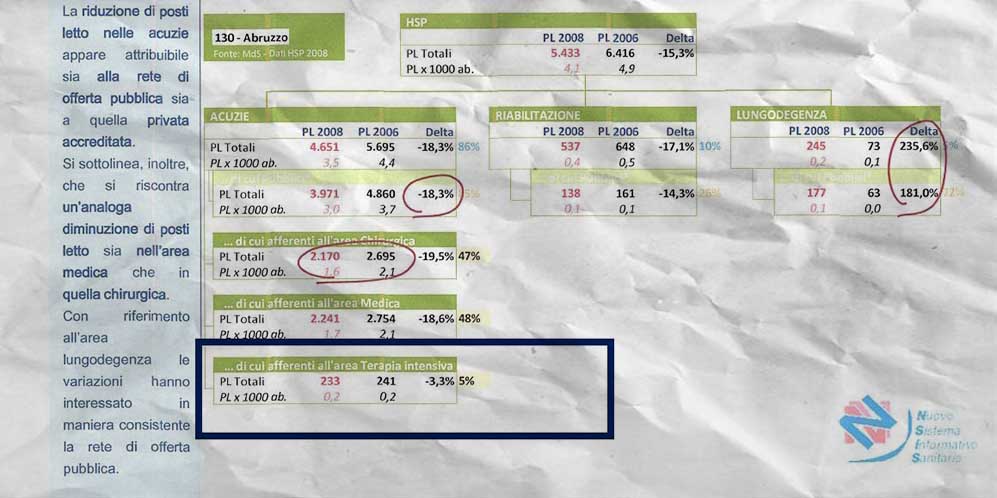 * Nella tabella [1] qui in apertura dell’articolo si evidenziano le riduzioni già effettuate tra il 2006 e il 2008 in maniera massiccia soprattutto a danno del pubblico. Senza tornare sui fatti della Sanitopoli abruzzese, le cui nostre denunce sono note, è evidente che dal 2008 in poi si è fatto anche peggio facendo piombare la sanità nel baratro attuale.