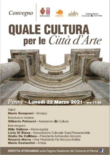 Penne – Si terrà lunedì 22 marzo, dalle ore 17.30, un confronto sul tema: “Quale cultura per le Città d’Arte”. L’iniziativa è promossa dall’assessore Gilberto Petrucci. Si confronteranno da remoto Giulio De Collibus (presidente Archeoclub Abruzzo), Rosaria Morra (vice presidente Fai Abruzzo-Molise), Mario Costantini (artista), Milo Vallone(attore-regista) e Licio Di Biase (Accendiamo il Medioevo).