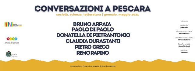 Il primo ospite della quarta edizione di Conversazioni a Pescara è stato Remo Rapino, Vita, morte e miracoli di Bonfiglio Liborio (minimum fax), la prossima Claudia Durastanti, La straniera (La nave di Teseo), e poi ancora Bruno Arpaia, Il fantasma dei fatti (Guanda), Paolo Di Paolo, Svegliarsi negli anni Venti (Mondadori), Pietro Greco, Homo. Arte e scienza (Di Renzo editore).