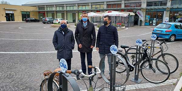 PESCARA – Un piccolo contributo allo sviluppo della mobilità urbanasostenibile. Arriva dalla Cna Abruzzo e di Pescara, che nei giorni scorsi ha fatto installare a proprie spese, in piazza Salvador Allende (di fronte alla propria sede di via Cetteo Ciglia 8) quattro stalli capaci di contenere otto biciclette. Questa mattina, piccola cerimonia di inaugurazione, presente con i direttori regionale e provinciale della confederazione artigiana, Graziano Di Costanzo e Carmine Salce, anche l’assessore comunale alla Mobilità urbana, Luigi Albore Mascia, i cui uffici hanno curato invece tutti gli aspetti relativi alle autorizzazioni. «Crediamo si tratti di un modello facilmente replicabile in vari luoghi della città – osserva Salce – da parte di altri enti ed associazioni che abbiano a cuore i valori ambientali, visto che si tratta dopotutto di cifre non certo esorbitanti e l’attenzione che il l’assessorato ha messo a disposizione per la parte amministrativa. Poter avere decine di stalli finanziati dai privati vorrebbe dire arricchire la dotazione della città intera, a beneficio di tutti».