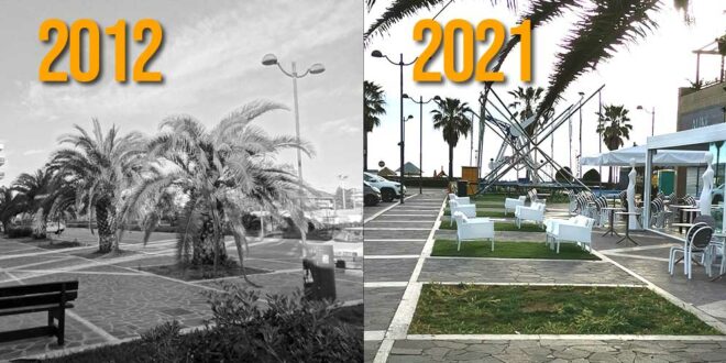 Montesilvano – «“Là dove c’era l’erba ora c’è una città” cantava Adriano Celentano nel 1966. A Montesilvano nel 2021, nel PP1 su Corso Strasburgo parafrasando “Il ragazzo della Via Gluck” si può affermare che là dove c’erano le palme ora ci sono “salottini” e erba sintetica. Delle 6 palme che ombreggiavano la piazza, ancora presenti nel 2012, ne sono rimaste appena 2, le altre estirpate perché ammalate, non sono mai state sostituite.»