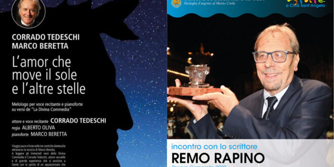 Città Sant’Angelo -Due grandi appuntamenti per Città Sant’Angelo, questa settimana. Giovedì 22 luglio 2021, alle ore 21:00, nel Giardino delle Clarisse, nel centro storico angolano, l’attore Corrado Tedeschi andrà in scena con lo spettacolo dedicato a Dante Alighieri, intitolato “L’Amore che move il sole e l’altre stelle”.