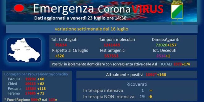 Del totale dei casi positivi, 19232 sono residenti o domiciliati in provincia dell’Aquila (+14 rispetto a ieri), 19615 in provincia di Chieti (+22), 18383 in provincia di Pescara (+16), 17695 in provincia di Teramo (+8), 594 fuori regione (+4) e 115 (-2) per i quali sono in corso verifiche sulla provenienza.