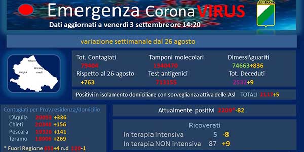Coronavirus: oggi in Abruzzo 87 nuovi positivi e un decesso – dati aggiornati al 3 settembre