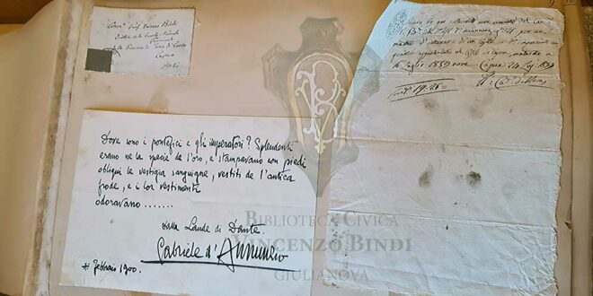 Giulianova – A seguito della richiesta avanzata dalla Biblioteca civica “Vincenzo Bindi” e grazie ad un finanziamento ministeriale della Soprintendenza Archivistica e Bibliografica dell’Abruzzo, hanno preso inizio con il trasferimento a Roma, le operazioni di restauro e di digitalizzazione del prezioso Album e della raccolta in esso contenuta di circa 450 prestigiosi autografi di illustri personaggi del mondo letterario, politico, artistico ed ecclesiastico.