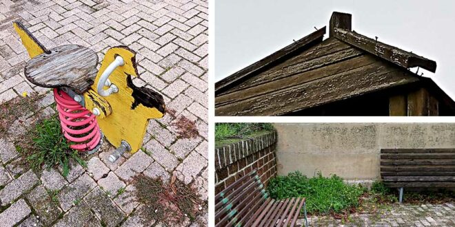 1) Attrezzature e giochi con strutture in legno e in ferro, installate da trent’anni, deteriorate e con evidente ruggine e fuoriuscita di chiodi  taglienti e pericolosi.