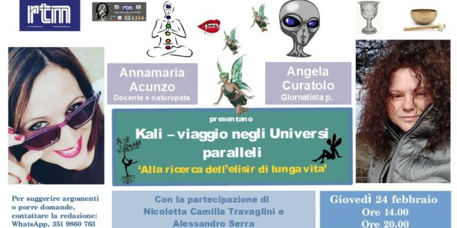 Un viaggio intenso e intrigante negli Universi paralleli con Kali, programma di informazione sul benessere e indagine sul mistero, condotto dall’inedita coppia Annamaria Acunzo, docente Docente in metodologie del benessere ed elettrologia applicata presso la scuola di Alta Formazione Comprendo a Montesilvano e naturopata, insieme ad Angela Curatolo direttore responsabile di GiornalediMontesilvano.com e Zaffiromagazine,com in onda sulla piattaforma radio www.rtmsilvi.com.