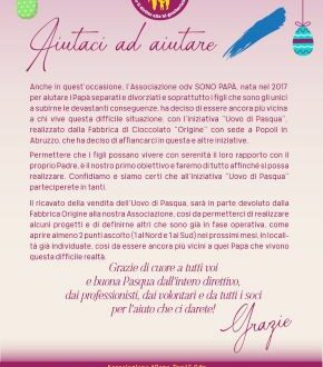 L’Associazione odv SONO PAPÀ, nata nel 2017, anche quest’anno, in un momento storico molto difficile, sarà vicina ai Papà separati e divorziati e soprattutto ai figli che sono gli unici a subirne le devastanti conseguenze, riproponendo in occasione della prossima Pasqua la 2° iniziativa “Uovo di Pasqua”.