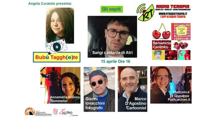 Bubù tagg(h)ete! Su Radioterapia, web Radio con sede a Montesilvano, domani, 15 aprile 2022, alle ore 16, c’è la puntata pasquale della trasmissione di Angela Curatolo con tanti ospiti da gustare e scoprire. Bubù tagg(h)te! È un Viaggio nelle curiosità, nei personaggi e nei fatti da scoprire con ospiti del panorama culturale e d’intrattenimento in studio.