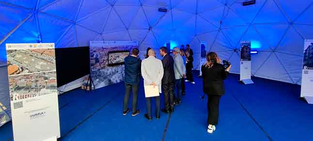Prima del convegno, il sindaco Biondi, insieme a Provenzano e a Vicchiarello, ha visitato la mostra fotografica “Sisma 6 aprile 2009 – Rinascere”, a cura dell’Usra, allestita nella cupola geodetica installata davanti all’Auditorium.