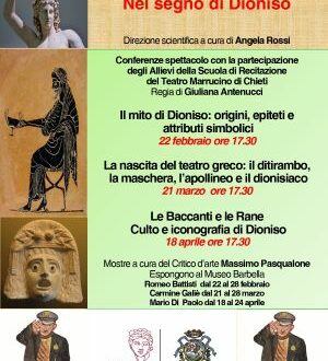 Chieti. L’Associazione ArteMind organizza la manifestazione OMNIA ARTIS, Patrocinata dal Comune di Chieti con direzione scientifica di Angela Rossi. Sono previsti 3 incontri mensili nel Museo Barbella, in cui verrà dedicato uno spazio culturale intitolato NEL SEGNO DI DIONISO con presentazione della Rivista di letteratura e didattica greca Scholia e approfondimenti sul mito di Dioniso e la relativa nascita del teatro greco. Saranno presenti gli Allievi della Scuola del Teatro Marrucino con la regia di Giuliana Antenucci per conferenze spettacolo. Saranno allestite tre mostre a cura del Critico d’arte Massimo Pasqualone.