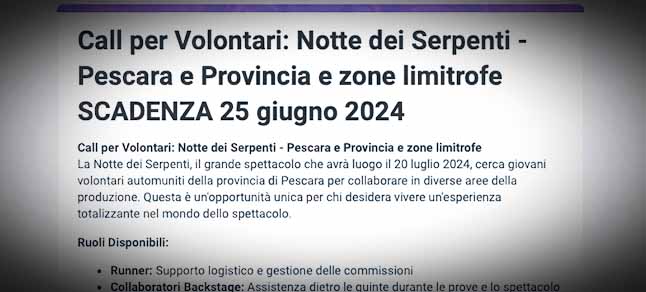 Pescara – Torna la Notte dei Serpenti, e l’organizzazione è alla ricerca di giovani volontari automuniti della provincia di Pescara per collaborare alla realizzazione dell spettacolo che si terrà il 20 luglio prossimo.