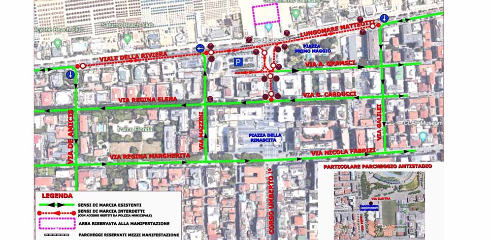 Da mezzanotte di lunedì e fino alle ore 20 di domenica 30 giugno (e comunque fino al termine delle operazioni di smontaggio degli allestimenti) i mezzi a supporto della manifestazione potranno transitare e sostare sul tratto di marciapiede lato mare della Riviera Nord in corrispondenza dello “Stadio del Mare”. Poi, tra le ore 15 di lunedì e le ore 20 di domenica 30 giugno 2024 (e comunque fino al cessare delle esigenze legate alla manifestazione), sarà in vigore il divieto di sosta e di fermata con rimozione forzata (ad eccezione dei mezzi a supporto della manifestazione), su una parte del parcheggio in adiacenza all’antistadio comunale tra via Pepe e via Elettra.