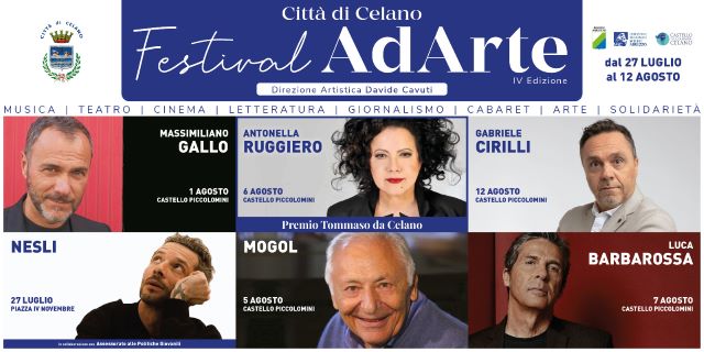 Ospiti di primo piano per la quarta edizione del “Festival Adarte”, sostenuto dall’amministrazione comunale e con la direzione artistica del maestro Davide Cavuti; tra gli appuntamenti, la serata di cultura e solidarietà “Premio Tommaso da Celano”, omaggio ad un grande Figlio d’Abruzzo