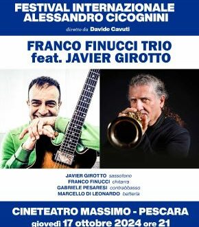 Pescara. Giovedì 17 ottobre, alle ore 21, al CineTeatro Massimo di Pescara, si terrà il concerto del “Franco Finucci Trio” composto da Gabriele Pesaresi al contrabbasso, Marcello Di Leonardo alla batteria e da Franco Finucci alla chitarra, autore delle musiche originali e degli arrangiamenti, con la partecipazione del sassofonista argentino Javier Girotto, nell’ambito del “Festival Internazionale Cicognini” diretto dal maestro Davide Cavuti.