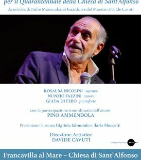 Francavilla al Mare. Un “Concerto di Gala” con la partecipazione dell’attore cinematografico, televisivo e teatrale Pino Ammendola, con il Maestro Davide Cavuti (che firma anche la direzione artistica della serata) e l’ensemble composto dal tenore Nunzio Fazzini, dal soprano Rosalba Nicolini e dalla pianista Giada Di Febo si terrà domenica 8 dicembre alle ore 19 (ingresso libero) per il quarantennale dell’inaugurazione della Chiesa di Sant’Alfonso a Francavilla al Mare. La serata sarà condotta dalle giornaliste Gigliola Edmondo e Ilaria Muccetti ed è stata ideata da Padre Massimiliano Guardini e dal maestro Davide Cavuti. In programma brani di César Franck, Pietro Mascagni, Franz Lehar; Giacomo Puccini e Giuseppe Verdi. L’attore Pino Ammendola reciterà il testo “Quanno nascette ninno” di Sant’Alfonso de’ Liguori da cui deriva il celebre canto natalizio “Tu scendi dalle stelle”.