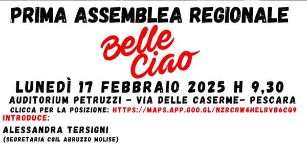 Lunedì 17 febbraio alle 9,30 presso l’Auditorium Petruzzi, in Via delle Caserme, si terrà la Prima Assemblea regionale Belle Ciao della Cgil. Si riuniranno le sindacaliste che, a ogni livello, dalle sedi territoriali ai luoghi di lavoro, si impegnano nella Cgil Abruzzo e Molise. Il loro impegno è quello di migliorare le condizioni e i diritti delle donne, in quanto tali e nei posti di lavoro. Per questo saranno chiamate al protagonismo nella campagna referendaria che si è appena aperta e che vedrà la Cgil impegnata nei 5 referendum del lavoro e della cittadinanza.