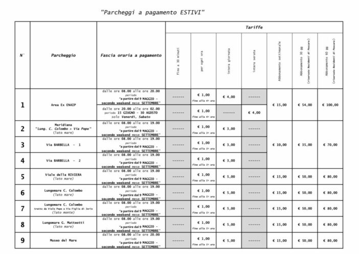 Pescara – A partire dal 9 maggio, e fine al secondo fine settimana di settembre, saranno attivi i parcheggi estivi a pagamento sulle riviere di Pescara. L’istituzione dei parcheggi estivi è prevista da una delibera di giunta e nei prossimi giorni è attesa l’ordinanza degli uffici.